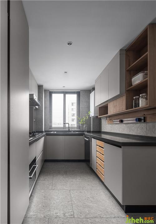 廚房定制了淺咖色的櫥柜,冰箱內(nèi)嵌其中;搭配上木色的開放格,常用物品拿取更加便捷,整體散發(fā)出溫潤柔和之美,滿足功能需求的同時(shí)又兼具現(xiàn)代時(shí)尚感。