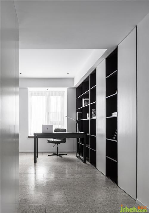 開放式的書房,氛圍、色彩、材質(zhì)保持了與整屋的統(tǒng)一性,與客餐廳聯(lián)通,視覺上大大延伸了空間感,在通透性和獨(dú)立性中做了很好的平衡。