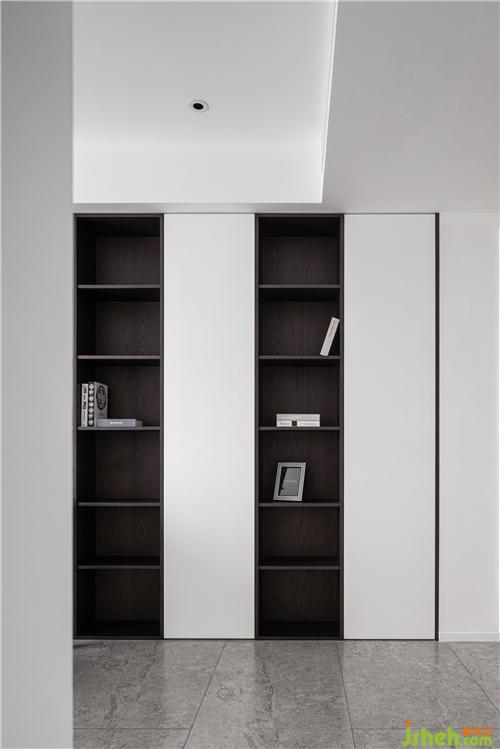 書房的書柜同樣采用了開放式與封閉式的結(jié)合,滿足不同收納需求;白色與咖色的搭配,更加突顯精致感與高級(jí)感。