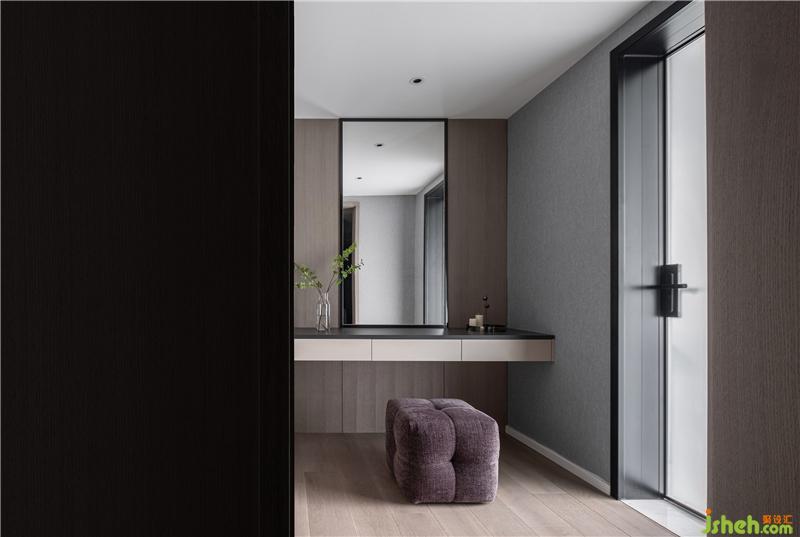 衣帽間以整潔的淺咖色護(hù)墻作為背景,簡約的流線呈現(xiàn)出干凈而富現(xiàn)代感的空間。懸空的抽屜柜,摩登感十足,在極簡中滲透出輕盈的美感。