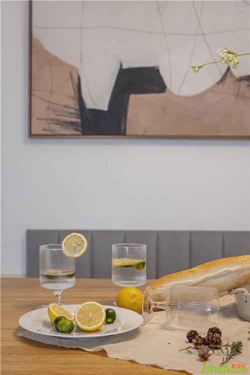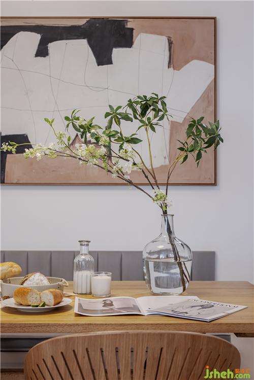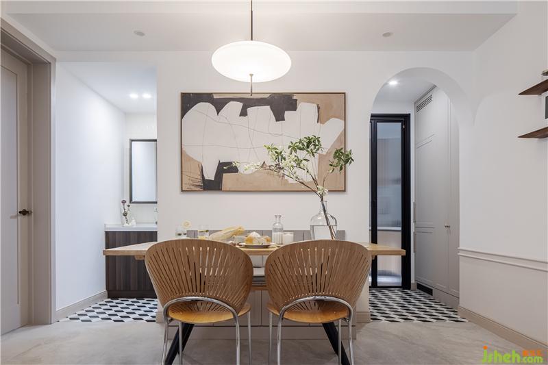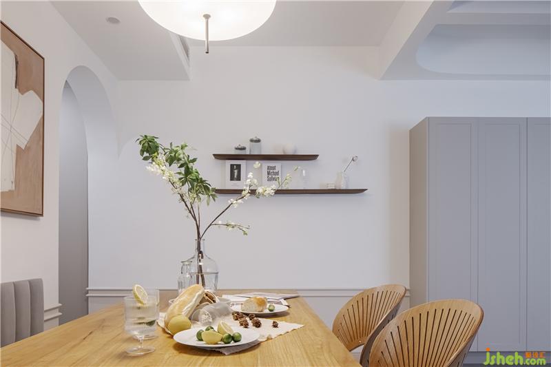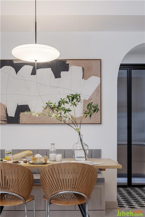 餐廳選擇明亮清新的白色、原木色構(gòu)成整個空間的色調(diào)。家具上選購了原木色的長方形餐桌和扇貝椅,盡顯實木的溫潤質(zhì)感,典雅與柔美并存,南京室內(nèi)設(shè)計師塑造出溫馨別致的居室美感。另一側(cè)設(shè)計了卡座的形式,增加收納空間,舒適與實用相結(jié)合。裝飾畫的色調(diào)與空間相匹配,給整屋增添了藝術(shù)氣息。通往廚房與衛(wèi)生間的過道門洞,分別以拱形和長方形的形式表現(xiàn),為空間注入別樣的活力。