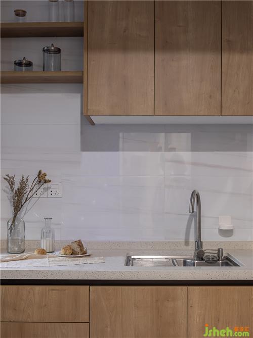 廚房采用原木色櫥柜和白色瓷磚的搭配,溫潤木質(zhì)與純凈白色的碰撞,營造了愜意溫馨的烹飪氛圍。