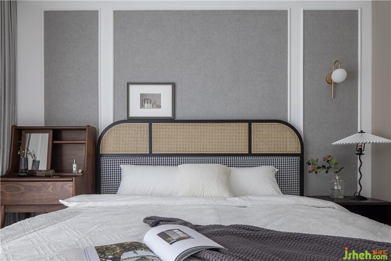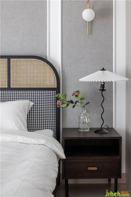 主臥選購了一款千鳥格軟包結(jié)合藤面的床,時髦與自然的融合,黑、白、木就像一件優(yōu)雅的“小洋裝”,搭配純白的床品,打造復(fù)古雅致、自然愜意的小空間。
