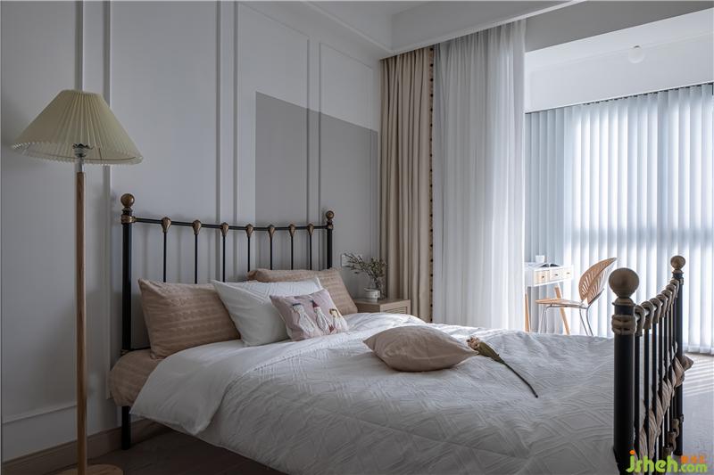床角搭配一盞米白色的落地?zé)?,立體式燈罩設(shè)計(jì),凸顯有層次的柔美感,南京室內(nèi)設(shè)計(jì)師美而優(yōu)雅。燕麥色的衣柜,與整屋色調(diào)相統(tǒng)一。
