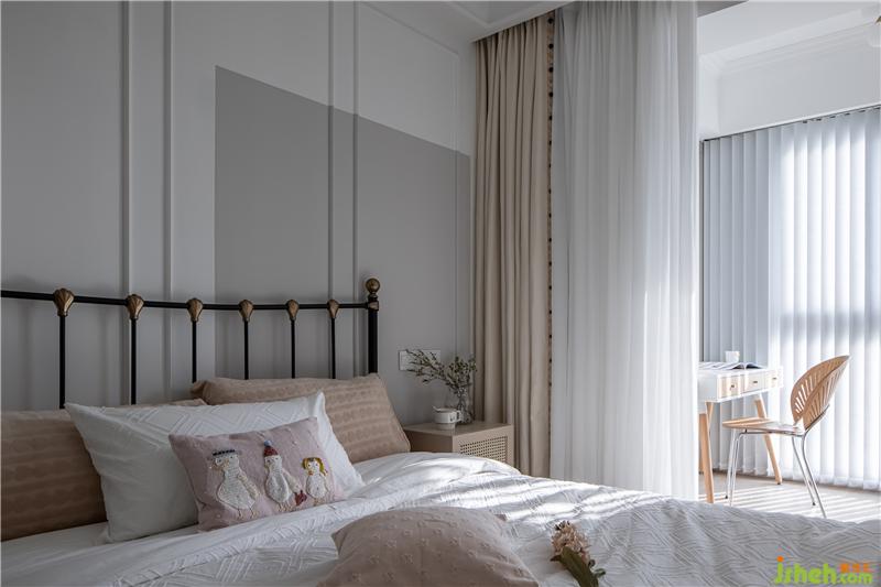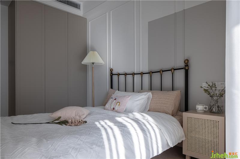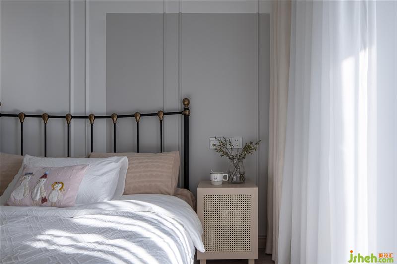床頭背景墻用簡(jiǎn)單的石膏線條作為裝飾,選擇一塊區(qū)域做了白色與灰色的撞色,給靜謐的空間帶來(lái)一絲時(shí)尚氣息。