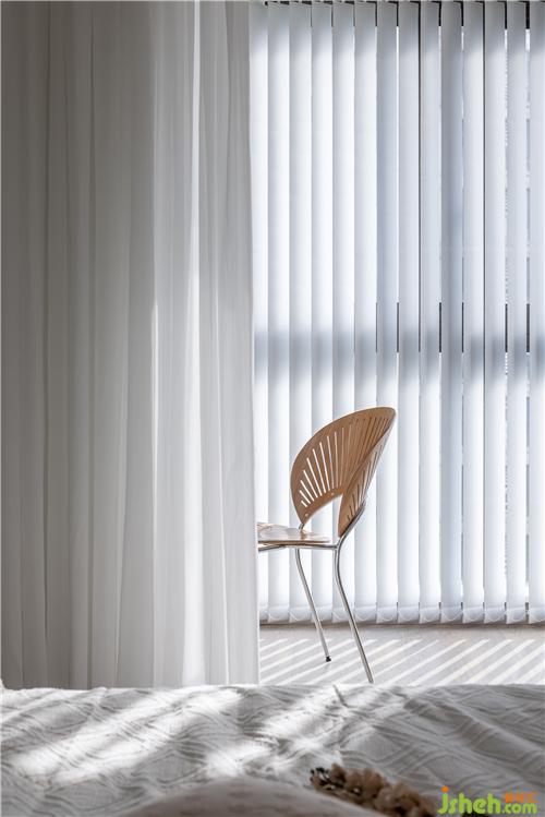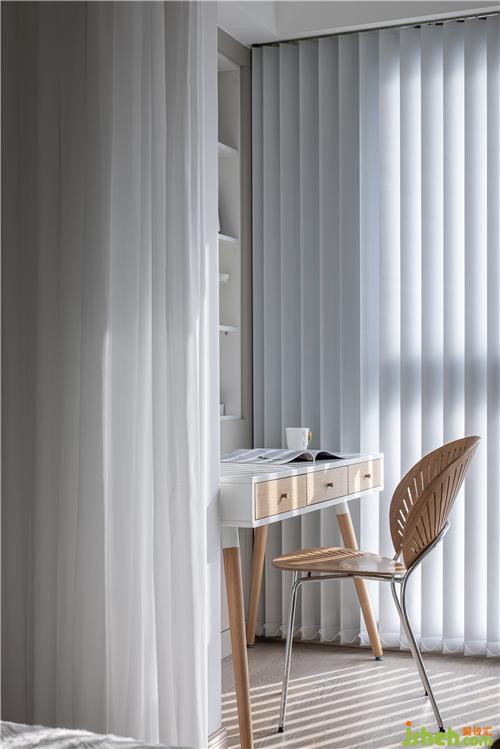 陽(yáng)臺(tái)納入到兒童房的空間,作為孩子的學(xué)習(xí)區(qū)。窗邊定制了豎百葉簾,能夠靈活控制光線的攝入,使得空間看上去更具美感。