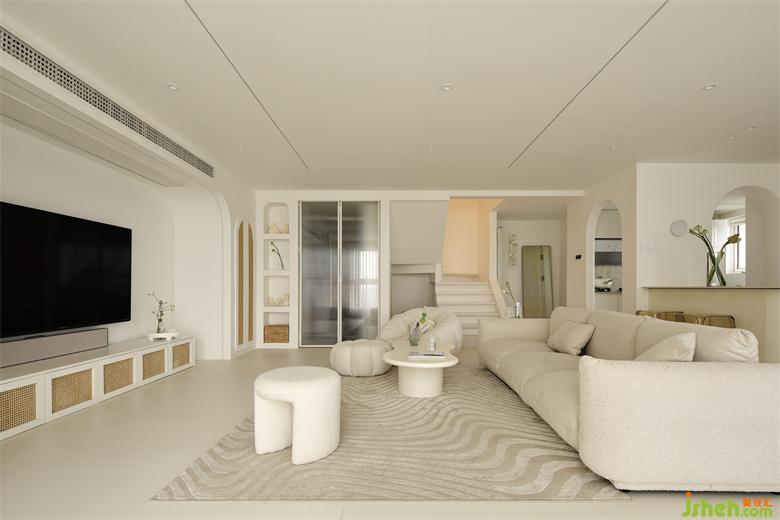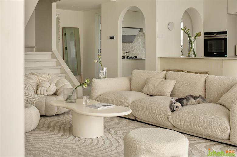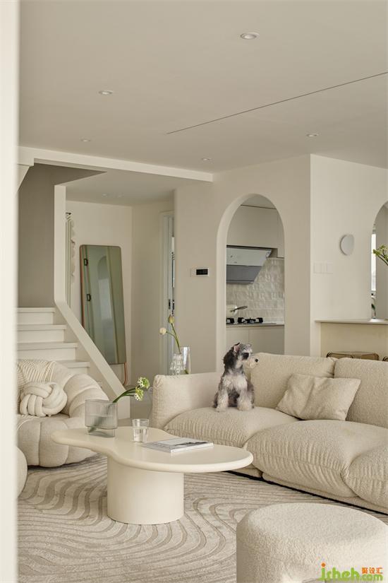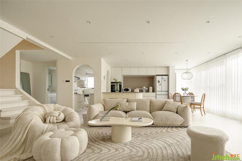 230㎡頂層復(fù)式,開放式的客餐廚設(shè)計(jì),打造溫潤(rùn)純粹的奶油法式侘寂風(fēng)