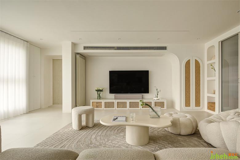 電視背景墻上方的吊頂一側(cè)做弧形設(shè)計(jì),與對(duì)面直角墻面形成強(qiáng)烈的對(duì)比,簡(jiǎn)約而有設(shè)計(jì)感,配合上奶油色的墻面,南京家居設(shè)計(jì)柔化了空間的格調(diào)。奶油色+藤編的電視柜,整體的色調(diào)清爽溫柔;分類收納客廳雜物,方便查找;不僅美觀,還能通風(fēng)透氣,防潮濕。