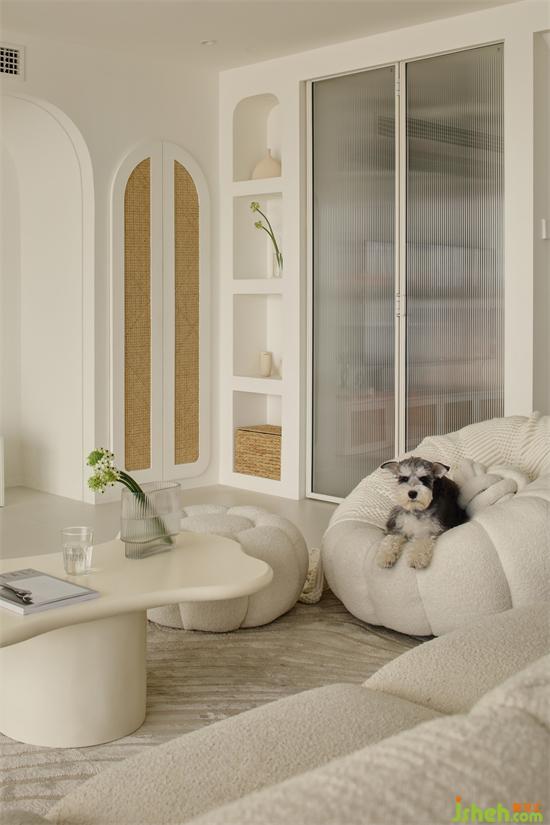 地毯居中布置奶油色的云朵茶幾,流暢的曲線外觀,避免磕碰,整體輕巧靈動(dòng),兼顧顏值與實(shí)用度。南京家居設(shè)計(jì)可愛的雪納瑞姑娘躺在柔軟的沙發(fā)上,不一會(huì)兒就進(jìn)入了夢(mèng)鄉(xiāng),好融洽的一幕呀~
