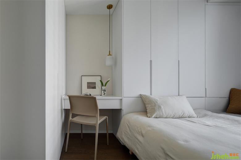 次臥購置了一款無靠背床,簡約雅致,無靠背的設計可以緊貼柜子放置,為臥室節(jié)約更多空間,南京家居設計給床尾留下更多的走動空間。床頭定制了白色的儲物柜,與白色的衣柜相呼應,簡約時尚,收納與美觀兼具。儲物柜和衣柜之間定制了挑空的寫字桌,懸空的設計,為空間增添了輕盈感;搭配一款精致的小吊燈,營造出一種靜謐的氛圍,滿足屋主簡單的辦公需求。