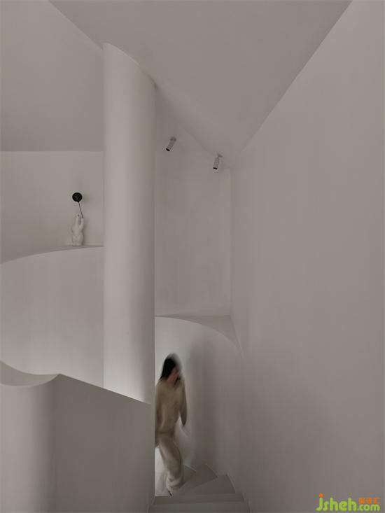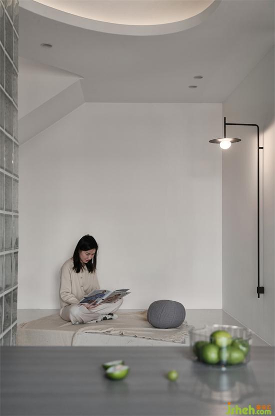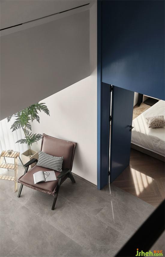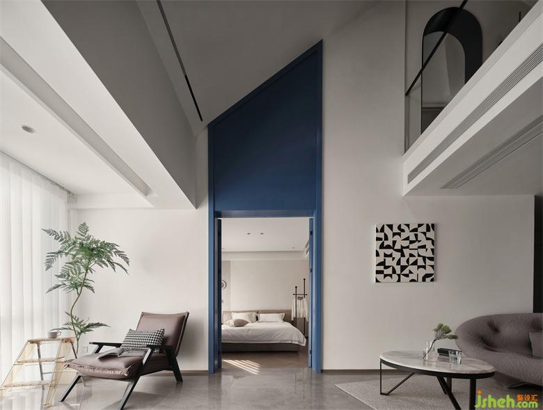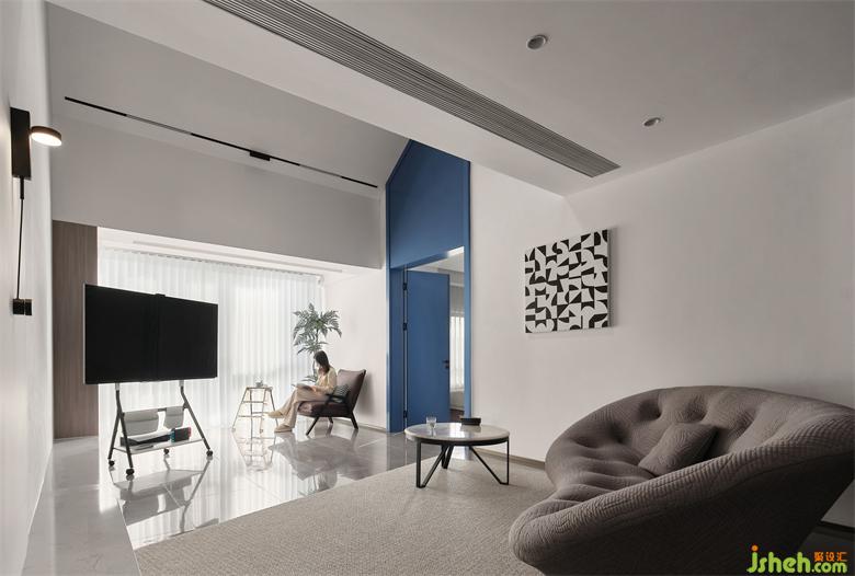 側(cè)墻和頂面梁都涂刷了藍色,帶來一種寧靜之感,在大面積留白的包裹中,又多了幾分柔和,讓空間盡顯清新和通透。