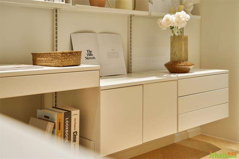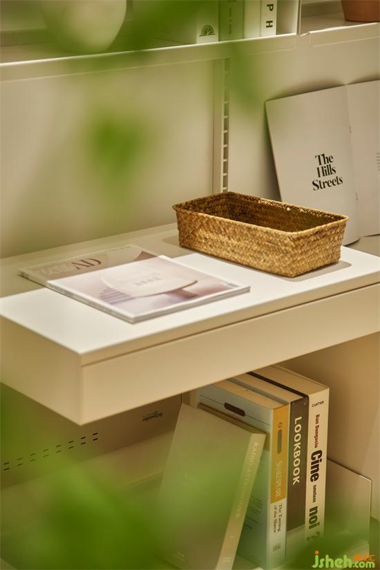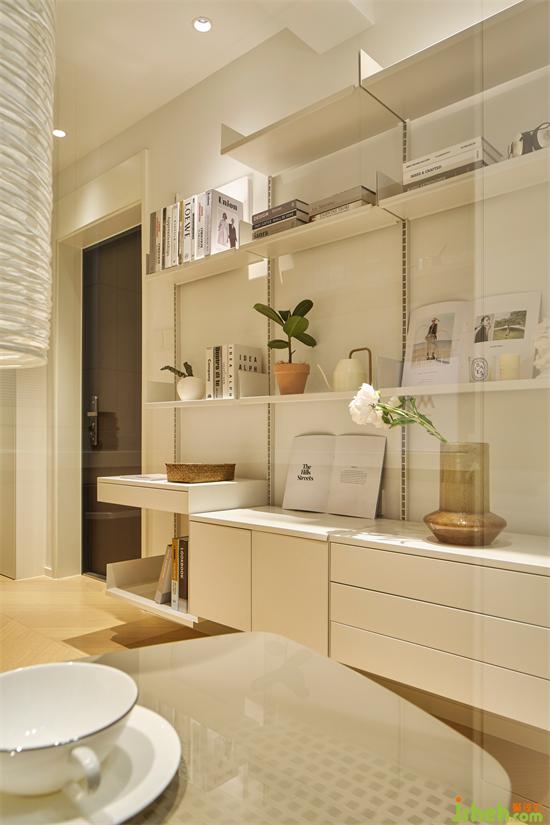 墻面通過擱板置物架系統(tǒng)打造了一面開放式收納墻,豐富的層次讓空間顯得更有趣,可以滿足多種物品的收納需求,南京銀城聚錦園家裝設計給緊湊的空間帶來一種呼吸感,于無形之中擴大了空間感。