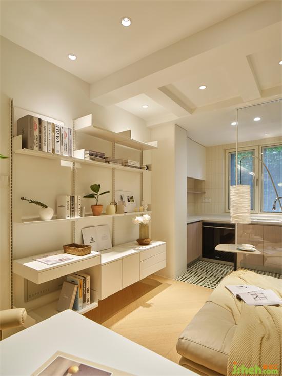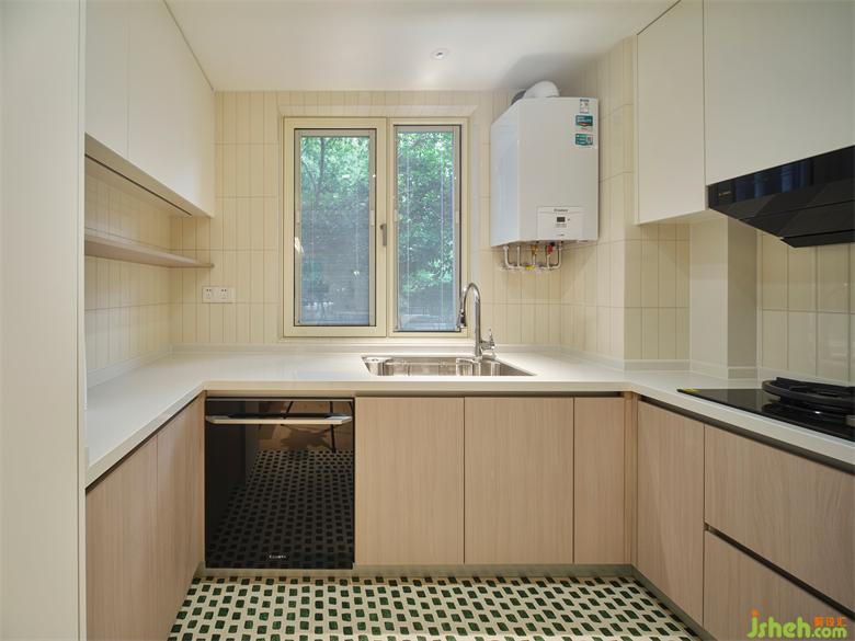 吊柜、落地柜和層板滿足廚房的收納所需,整體采用淺色基調(diào),暖白、米白和木色的搭配,給人明亮溫馨的視覺體驗(yàn)。