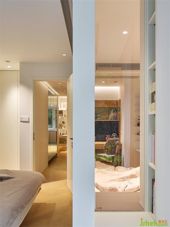 原臥室分隔一部分空間作為兒童房,在主臥和陽(yáng)臺(tái)交接處用透明玻璃作為隔斷,引入陽(yáng)臺(tái)采光,增加空間的通透感。