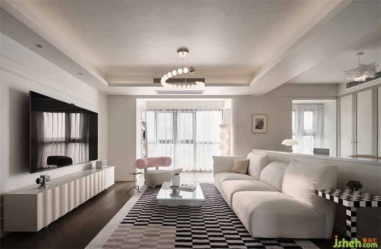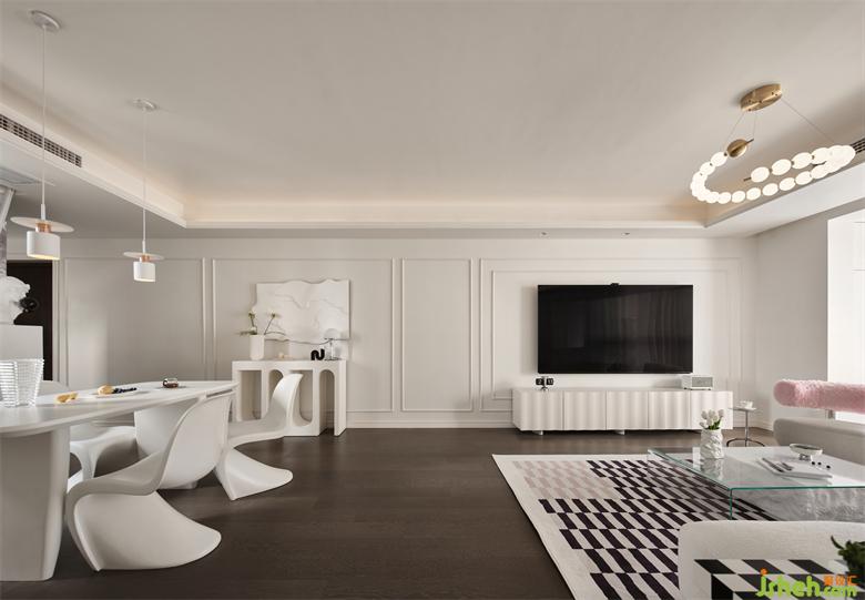 客廳空間以溫潤的奶白色為主色調,將現(xiàn)代風格與法式元素相融合,南京世茂璀璨江山精裝房改造打造出溫柔治愈又有高級感的家居空間。