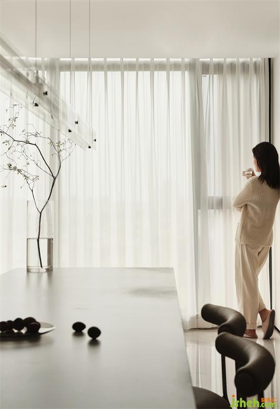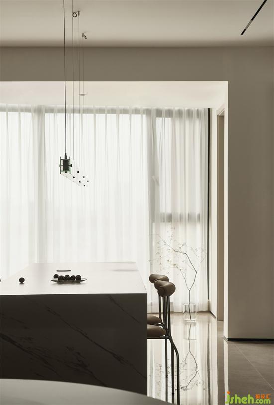 西廚區(qū)和北陽(yáng)臺(tái)相連通,與南陽(yáng)臺(tái)相呼應(yīng),在自然光線的透射下,家裝設(shè)計(jì)既能坐擁戶外的無(wú)限風(fēng)光,又能帶來(lái)充足的光線,讓家充滿閑適的氣息。
