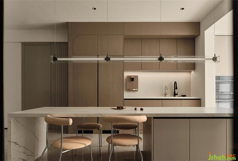 西廚區(qū)中間位置設(shè)計(jì)中島,南京藏龍御景家裝設(shè)計(jì)滿足用餐的同時(shí)又能增加收納;西櫥柜定制咖色和暖灰色,保證空間色調(diào)的統(tǒng)一,滿足功能的同時(shí)顯得格外的溫馨和舒適。