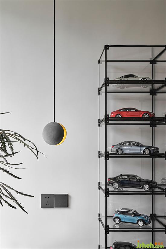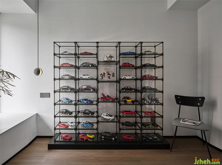 二層朝北的次臥作為活動(dòng)室,男屋主喜愛收藏車模,購(gòu)置開放式展示架,將各種模型收納于此。