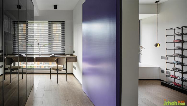 從活動(dòng)室方可進(jìn)入書房,打造一間安謐之所,兩個(gè)空間以紫色的木質(zhì)推拉門相隔,與娛樂室的紫色背景墻相呼應(yīng),在清澈淡雅的空間中增添一份明媚浪漫。沿墻定制一排頂天立地的書柜,采用黑色的玻璃柜門,增加收納的同時(shí)又帶來高級(jí)感。