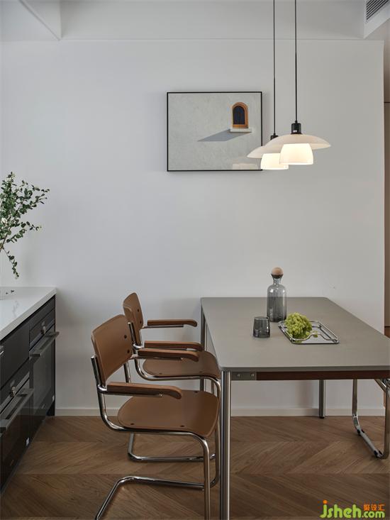 餐廳靠窗位置原本是飄窗,拆除之后定制餐邊柜,使得餐廳的組成形式更豐富,不但實用性得到提高,深灰色的柜體也給空間帶來了極具腔調(diào)的美感。南京瓏玥名邸精裝房改造長桌+四把餐椅的組合,加入大量的金屬質(zhì)感,水泥灰、黑色的相互融合,簡約的氛圍讓人倍感舒適。