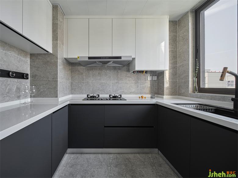 沿廚房的三面墻布局,形成一個“U”字型,為放置電器、多人同時備餐提供了更充裕的空間,操作面最大、動線最短、空間利用率最高。南京瓏玥名邸精裝房改造采光充足的廚房空間,櫥柜采用白色吊柜+深灰色地柜的搭配,明暗色澤對比愉悅,清新中凸顯沉穩(wěn),更顯簡約風格氣質(zhì)。