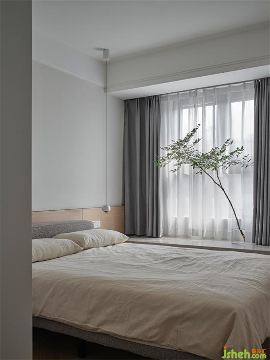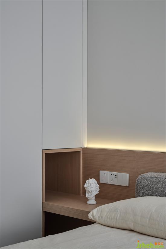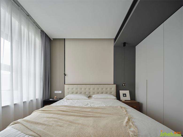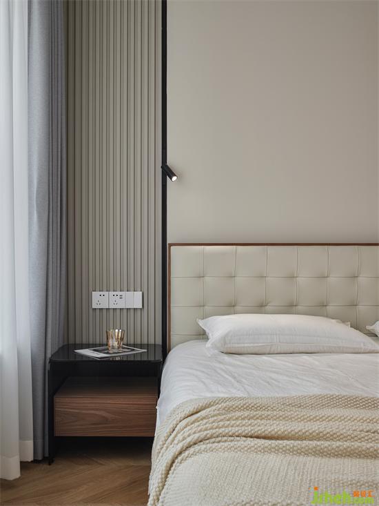 主臥在現(xiàn)代的基礎(chǔ)上,選擇了成熟穩(wěn)健的配色,床頭背景墻采用米白色+深灰色的撞色組合,搭配整排的白色衣柜,整體呈現(xiàn)寧靜和諧的氛圍;一側(cè)利用木色的格柵做裝飾,增加視覺上的層次感,簡約中更顯溫潤和設(shè)計感。南京瓏玥名邸精裝房改造購置米白色的軟包床,松軟的靠背讓倚靠更愜意,帶來滿滿的安全感。