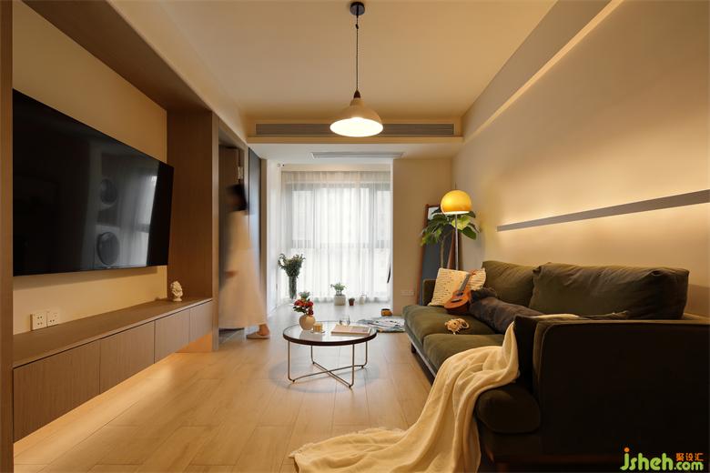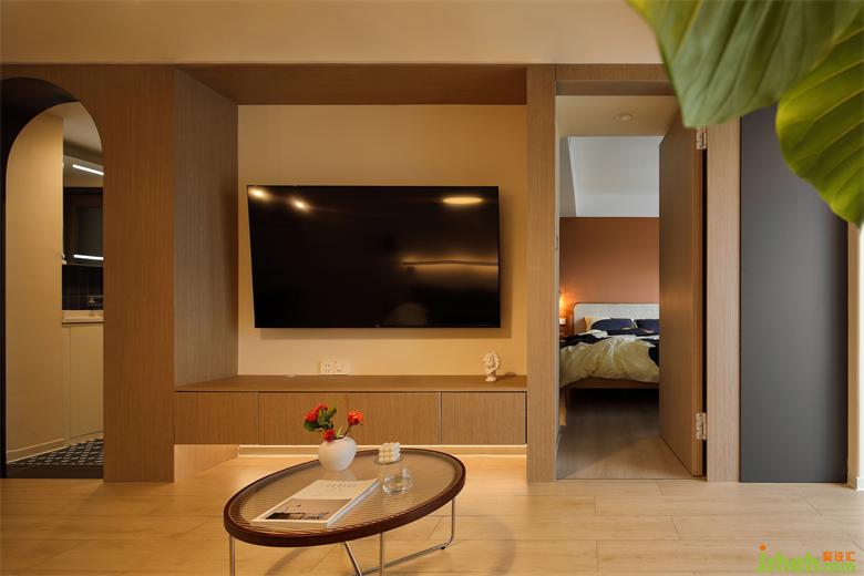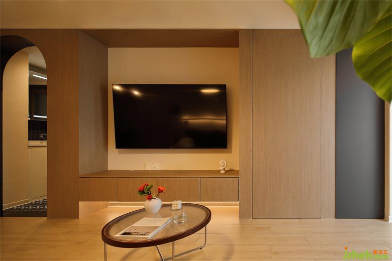 電視背景墻的四周用原木色的木飾面打造,讓奶白色的墻面多了一絲溫潤感和自然。電視柜采用了懸空的設計,不占空間,還避免了衛(wèi)生死角,將電視柜與兩側(cè)木飾面結(jié)合在一起,起到了裝飾的整體性;上方留了兩個明裝插座,方便各種多功能小電器的使用;下方加入燈帶,塑造了空間的層次感與精致感?;榉吭O計通往次衛(wèi)的門洞設計了拱形,劃分出獨立的兩個區(qū)域,柔化空間的視覺效果,提升了整屋的顏值和藝術(shù)氣質(zhì)。
