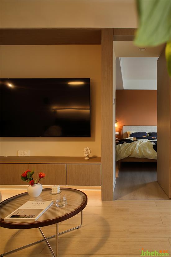 沿著電視背景墻一側(cè),進入主臥的門設計了隱形門,分隔公共區(qū)和私密區(qū),婚房設計運用了統(tǒng)一的原木色木飾面材質(zhì),營造出沉穩(wěn)的自然氛圍感,給人溫暖、質(zhì)樸的體驗,無門框無把手的設計又保證了背景墻的整體性和美觀性。