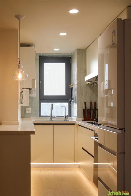 為了提升廚房的體驗感,廚房設計了開放式,少了門與墻的隔斷,動線更流暢舒適,操作起來也更加寬敞。吊頂采用石膏板吊頂,內(nèi)嵌三個筒燈,與餐廳之間的銜接更加和諧美觀。家裝設計墻面鋪貼了淺藍色的復古磚,自帶漸變色;地面由客餐廳延伸進來的地板磚鋪貼,保持空間的整體感;櫥柜定制了奶白色,整體色調(diào)清新淡雅,輕松提亮空間明度。櫥柜一側(cè)向餐廳延伸出一米的長度,頂面安裝一款玻璃小吊燈,這里可以作為小吧臺的使用,從冰箱里拿出來的酒水飲料可以直接在這里暢飲,和家人朋友可以坐在這里喝喝茶聊聊天,一個小小的角落,就可以讓整個家變得更加溫馨。