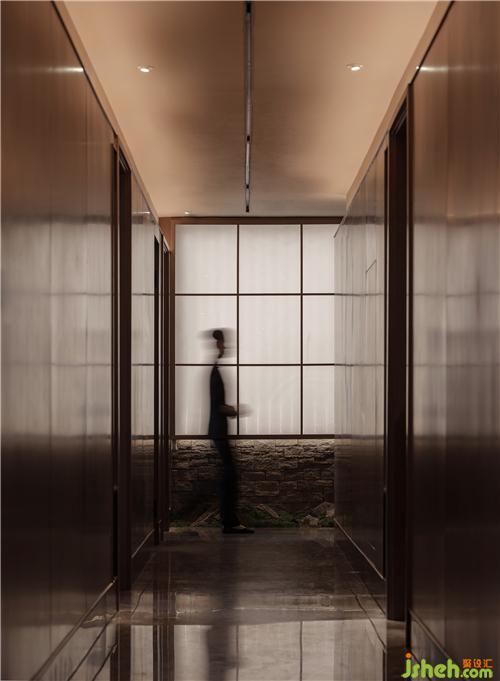 設(shè)計之初,肯納面臨的首個問題是解決空間布局,這座曾經(jīng)由浴池改建的別墅內(nèi)部空間散亂無章。于是,肯納設(shè)計將原有舊樓梯拆除,重新布局將建筑整體貫通,并在緊鄰扶梯處設(shè)置開闊筆直的主通道串起整個內(nèi)部空間,抵達(dá)兩側(cè)功能區(qū)與包房的動線均做減法處理,明朗、克制的手法將整個空間的氣韻向下沉淀。
