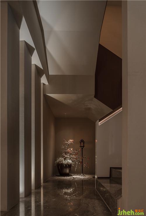 素色結(jié)構(gòu)立柱頂天立地,光線經(jīng)縫隙穿流而過,在天花與墻面形成光影,它們可以是文人書房格柵的想象,也可以是縱橫山岳起伏的解構(gòu),空間不動聲色,但已交出一切。