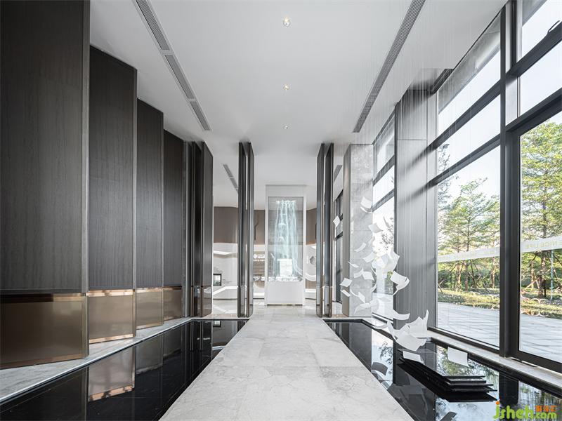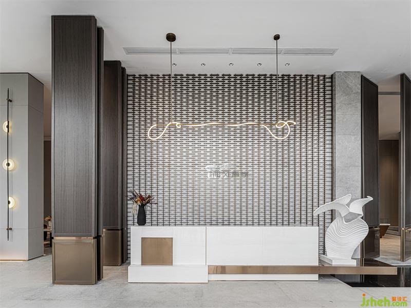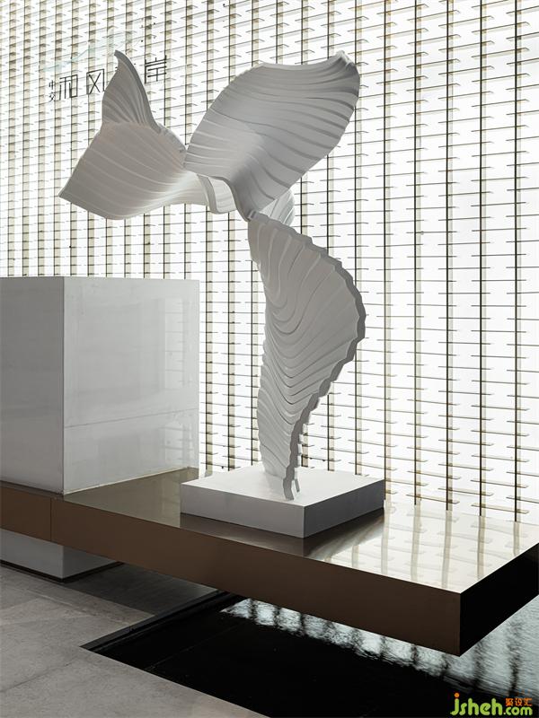 售樓部設(shè)計中入門空間用于調(diào)動參觀者的情緒,極具構(gòu)成感的形式,強(qiáng)化了空間的節(jié)奏,選擇關(guān)聯(lián)的元素和形態(tài)上的優(yōu)雅,感受純粹的力量。幻化無窮的“水”形態(tài),被線條感,抽象化的自然美學(xué)形態(tài)呈現(xiàn)在了空間中。