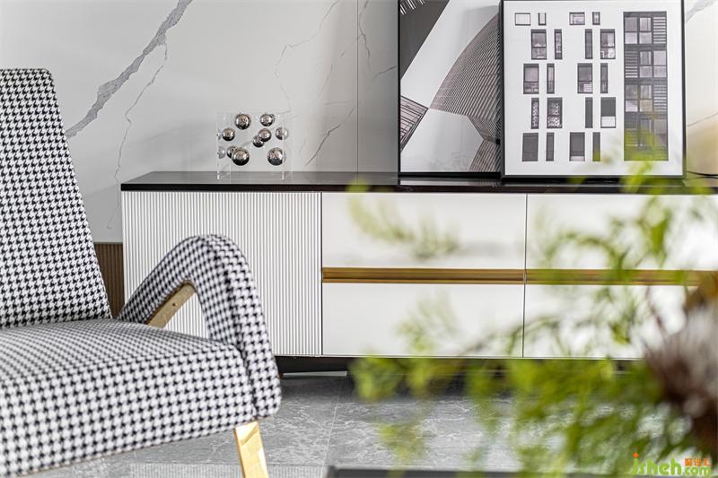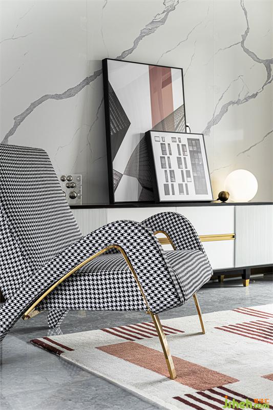 樣板房設(shè)計(jì)契合背景墻的米色沙發(fā)自帶高級氣場,配合黑白格紋加金屬單人椅,幾何造型打破黑色大理石茶幾的冷冽感,表達(dá)溫馨和藝術(shù)氛圍。紋路清晰的玻璃器具與跳脫的金屬擺件相碰撞,裝點(diǎn)空間的同時,形成強(qiáng)有力的視覺沖擊。