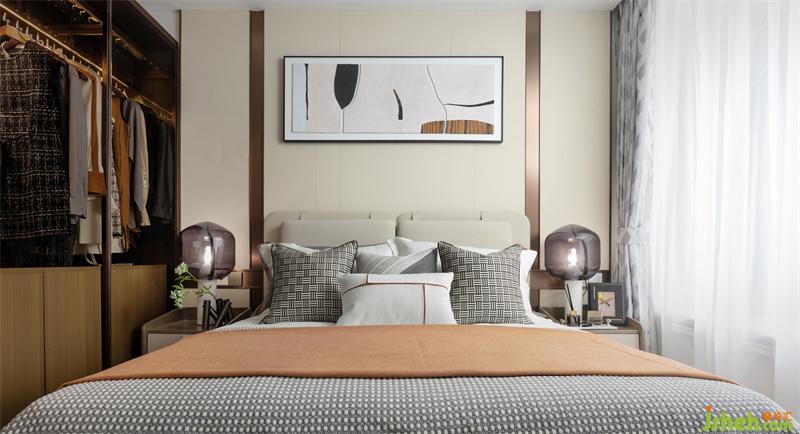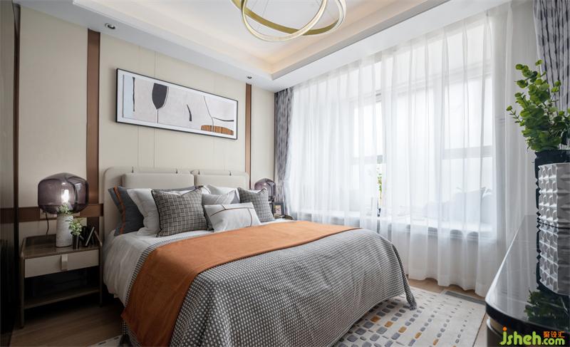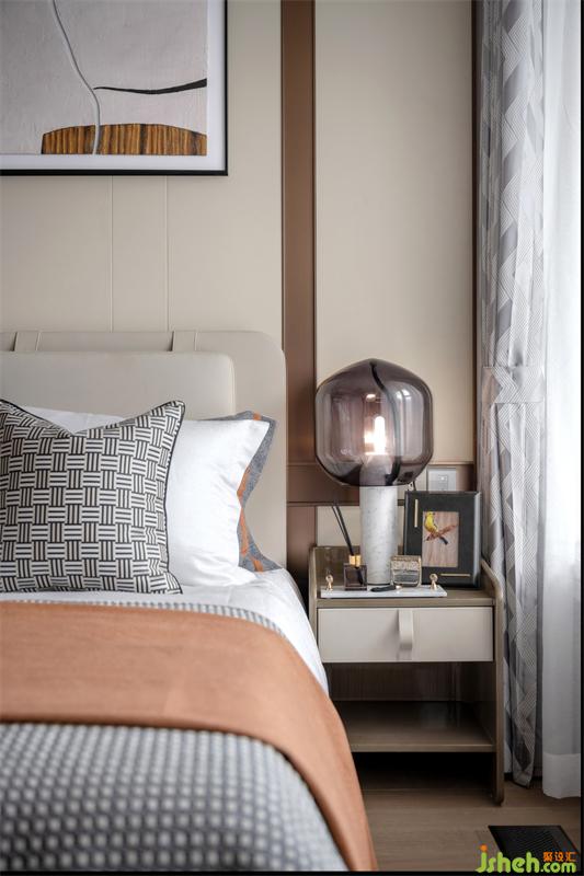 空間是有溫度和氣質的,需要居者親自抵達,細細領會。主臥打造時尚優(yōu)雅的中性色調,局部點綴橘色床品與擺件,一剛一柔,細節(jié)處混搭的撞色為空間注入活力,更顯層次感,讓光線參與設計,臥室在光環(huán)境的二次營造中悠然打開,整個空間都統(tǒng)一在柔和溫馨與自然當中。