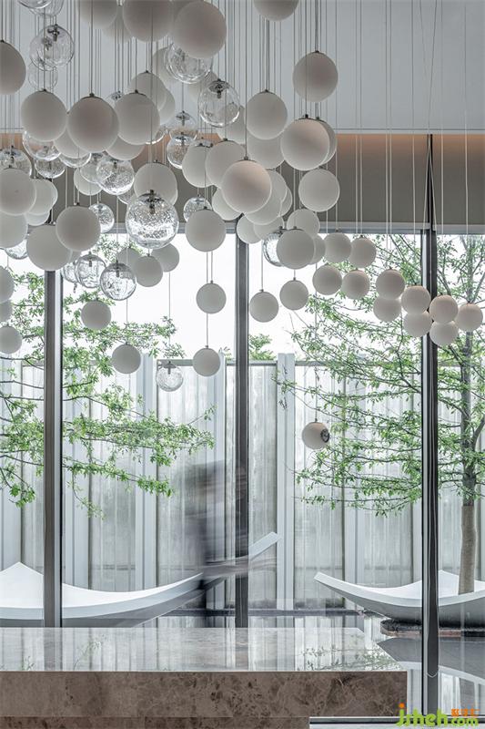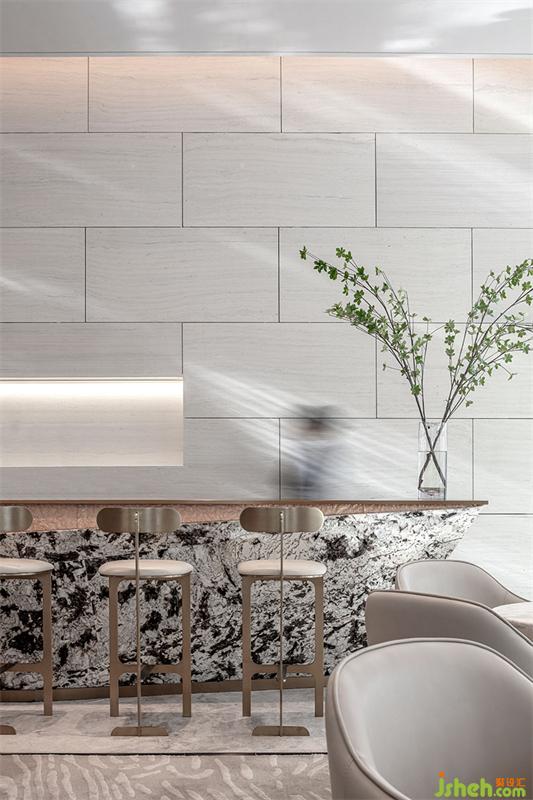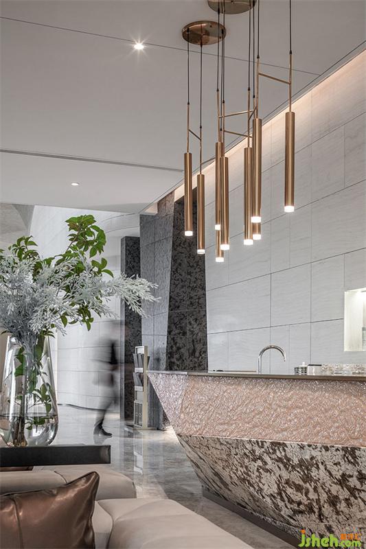 光通過格柵與水吧臺(tái)的綠植相交織,金屬裝飾錯(cuò)落有致,空間的剛?cè)嵬瑯?gòu)讓視野更加聚合于此,抬頭星光點(diǎn)點(diǎn),勾描著未來的科技感,直挺垂下的金屬吊燈,彼此平行有秩,衍生出序列的體驗(yàn)感,讓藝術(shù)的靈魂滲透進(jìn)有序的空間體量中。