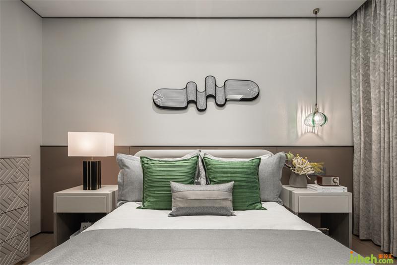 棕色墻裙奠定了空間沉穩(wěn)的格調(diào),帶有波浪造型的裝飾畫和綠色床品的加持,讓空間不恪守死板,帶給我們眼前一亮的新鮮感。