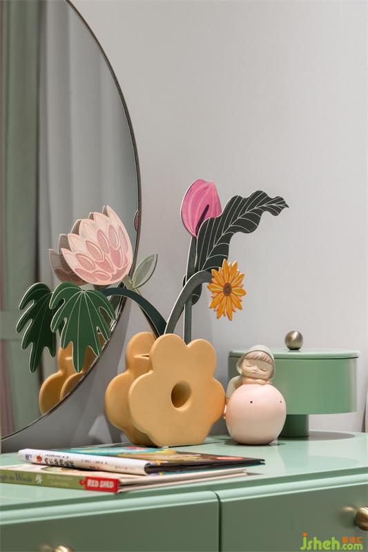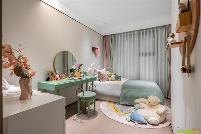 女兒房的整體色調(diào)以低飽和度的搭配呈現(xiàn),保持精致感的同時又不失活潑圓潤,一改傳統(tǒng)設(shè)計中過量的粉飾,清淡純真的色調(diào),像少女綻放的內(nèi)心世界,讓人留戀著迷。