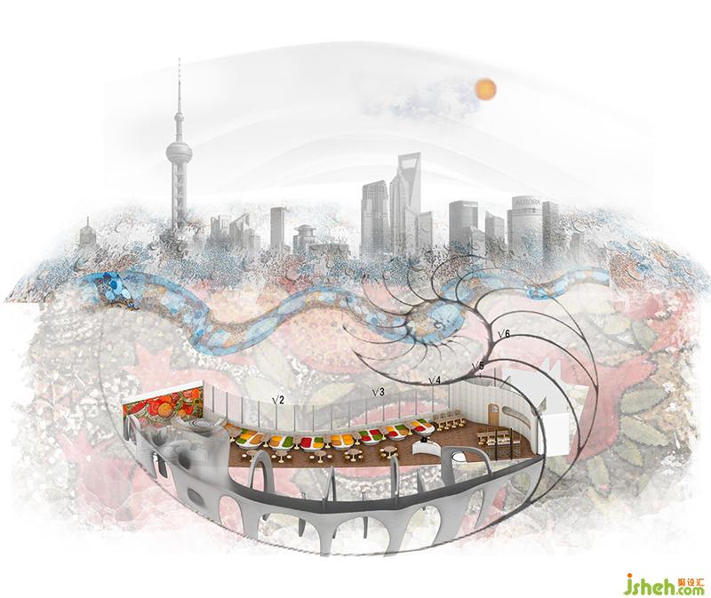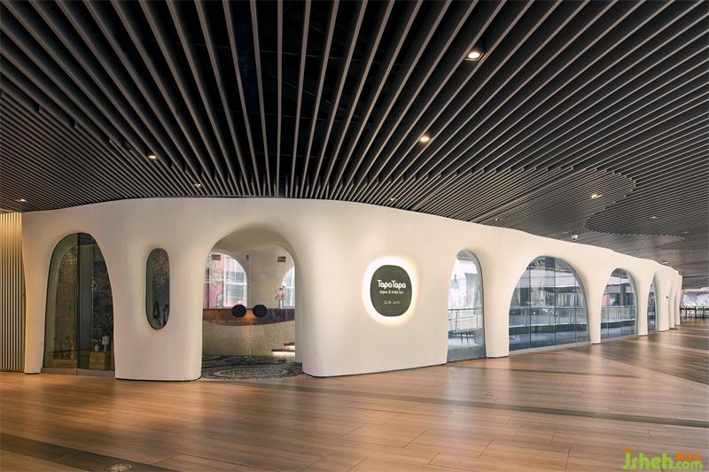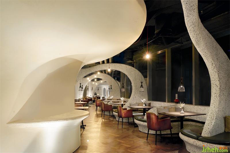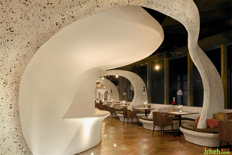 上海Tapa Tapa西班牙餐廳,位于北外灘白玉蘭廣場,其經(jīng)營理念是打造一個融合了巴塞羅那熱情和上海小資情調(diào)的餐飲空間,開創(chuàng)一個既有西方地中海浪漫風情又兼具東方優(yōu)雅含蓄的生活場域。上海餐廳設計為了兼具融合這兩種地域文化的特點,CROX闊合以 "海的回聲" 為設計概念,將自然的渦漩體作為整個空間的基礎,海螺的紋路一圈圈巧妙的安排在細長形的場地內(nèi),像是一處既開朗又神秘的洞穴。天然的韻律在此自由、豐富、隨心所欲的流淌,為賓客帶來非常愉悅的視覺觀感和用餐體驗。