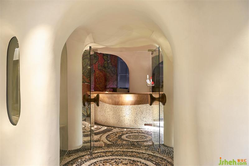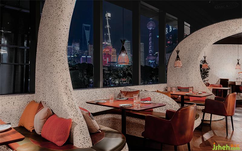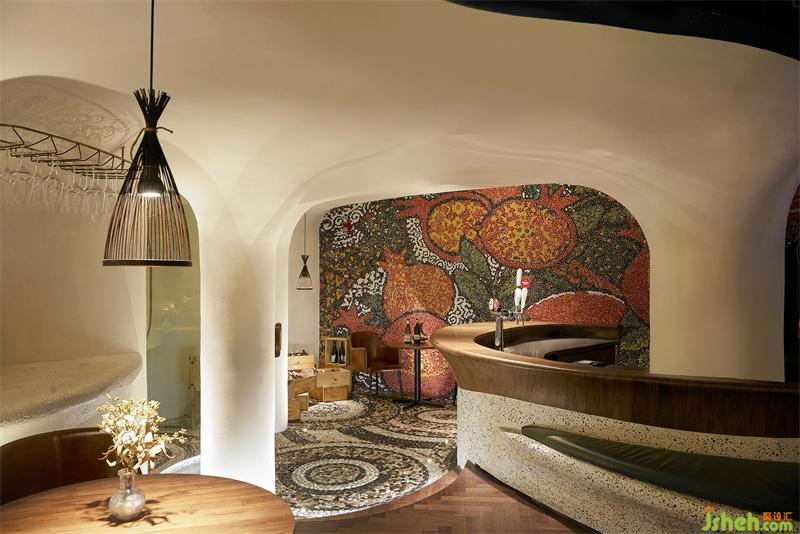 人們推開如同軟木瓶蓋的把手,首先映入眼底的是一整片馬賽克拼貼的紅石榴壁畫,上海餐廳設計鮮紅欲滴的色彩,仿佛空氣彌漫出如sangría(西班牙的一種汽酒)那樣迷人果味。