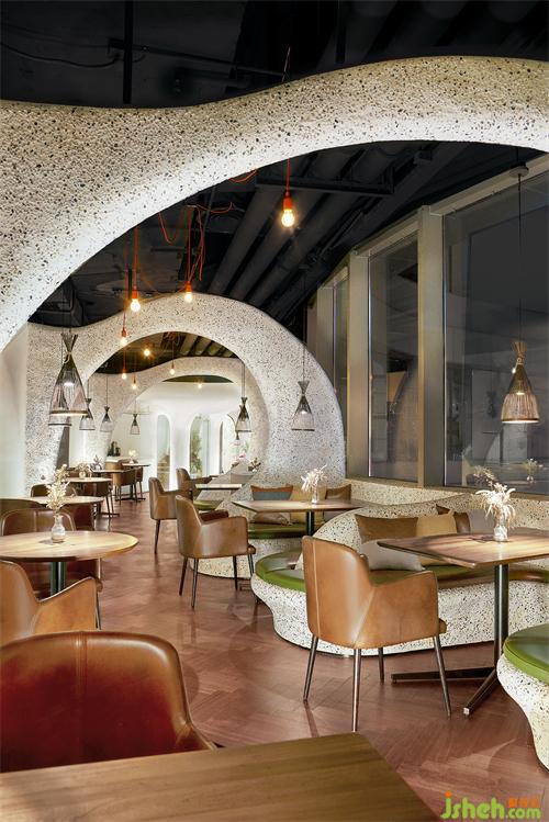 一個個獨立的就餐空間像是一段段不同的音場,伴隨著流淌的長椅與飄舞的石子墻,幻化如蜿蜒流淌的音波。