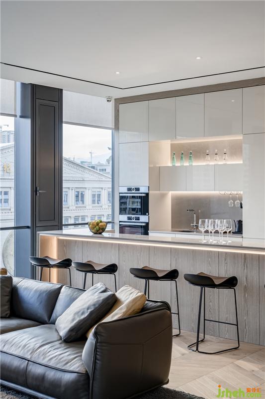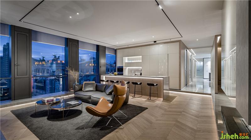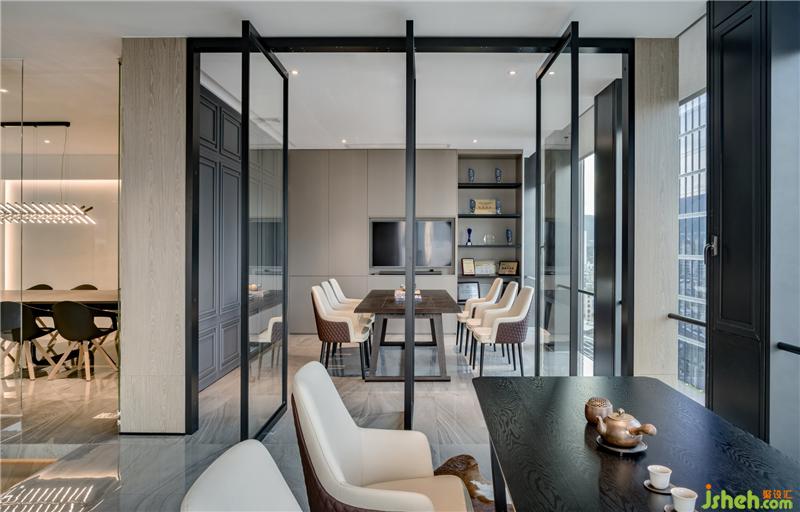 由于整棟大樓玻璃幕墻結(jié)構(gòu),因此工作室就像一個(gè)三面體的玻璃盒子,光線充足。豐富的玻璃隔斷形成通透的空間,相互貫穿,模糊了空間屬性。每個(gè)空間并非獨(dú)立存在,而是相互銜接。敞亮通透的空間,削弱了墻體結(jié)構(gòu)帶來的局促感,為團(tuán)隊(duì)成員之間的溝通、互動(dòng)塑造了一個(gè)開放的辦公環(huán)境。辦公室設(shè)計(jì)
