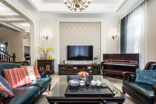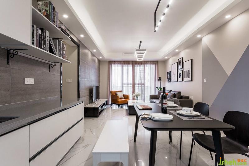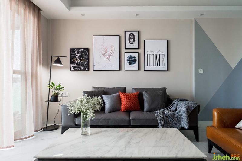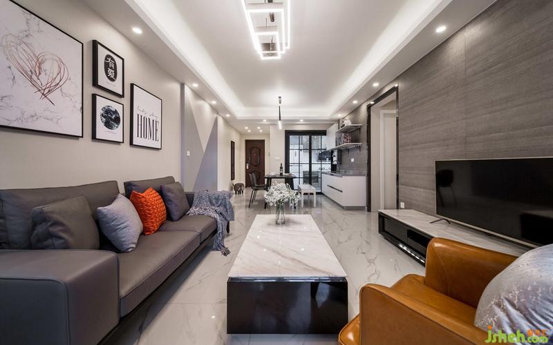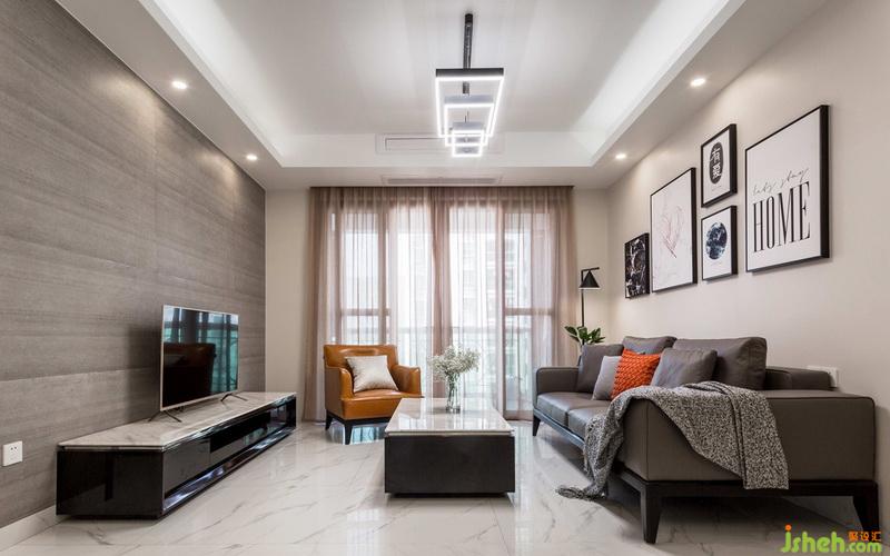 現(xiàn)代風格以灰色為基調(diào),橙色沙發(fā)和抱枕讓整個空間看起來不那么壓抑;電視墻采用1200X600磚上墻,配合黑白烤漆電視柜,使整個客廳的空間顯得寬闊和大氣。