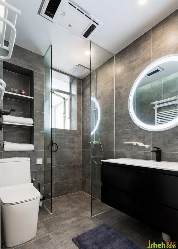 客衛(wèi)利用包管位置,做成了壁龕,增加了衛(wèi)生間的儲(chǔ)物功能,淋浴區(qū)室內(nèi)設(shè)計(jì)師利用兩塊到頂透明玻璃,摒棄常規(guī)淋浴門(mén),中間地磚采用角度鋪設(shè),起到干濕分離的作用。