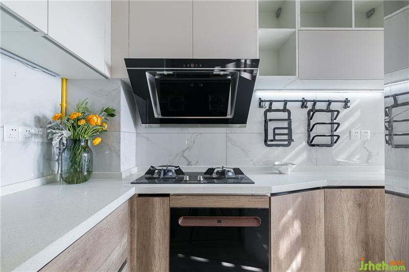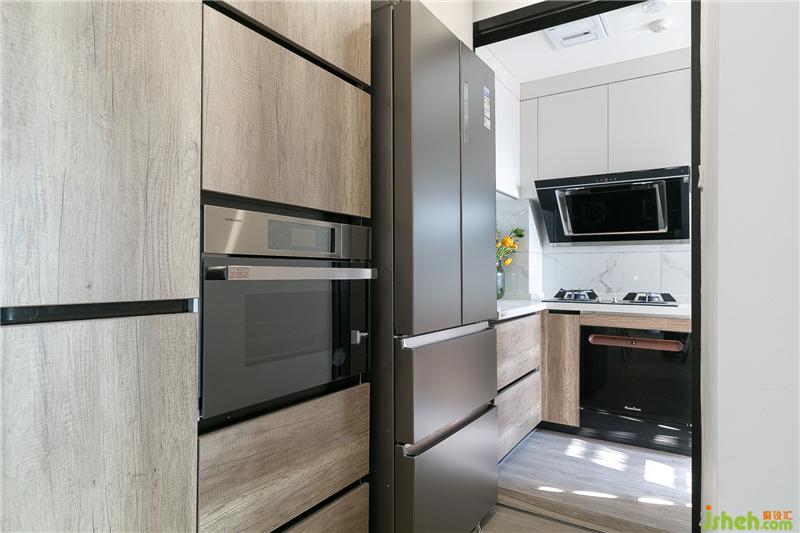 廚房門設(shè)計成三折的推拉門,油煙不大的時候可以隱藏在冰箱側(cè)面(其實大部分是打開的),廚房的空間更加的通透。