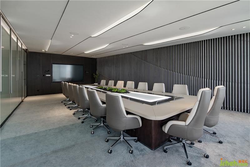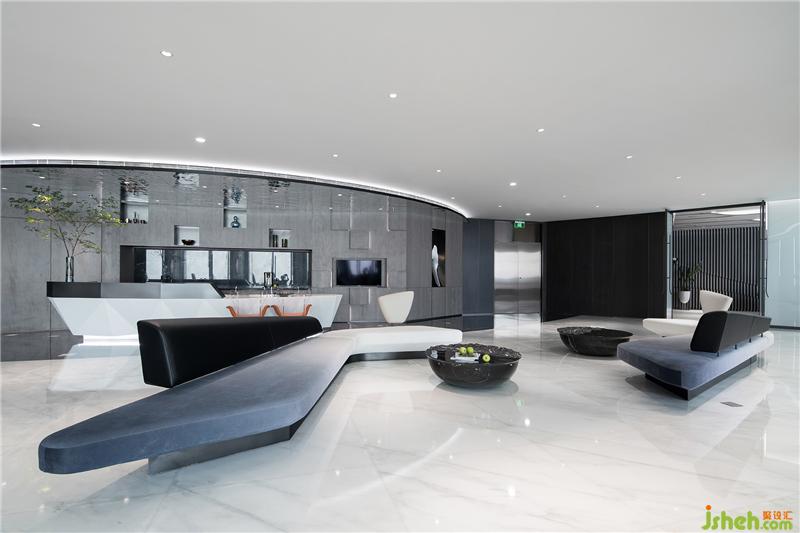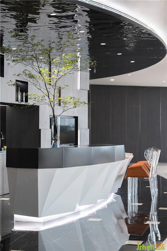 水吧臺的頂面、地面、墻面劃出一個獨立區(qū)域塊,切面的造型則呼應大廈的建筑結構,使得硬裝與建筑相融,軟裝自硬裝中生長。