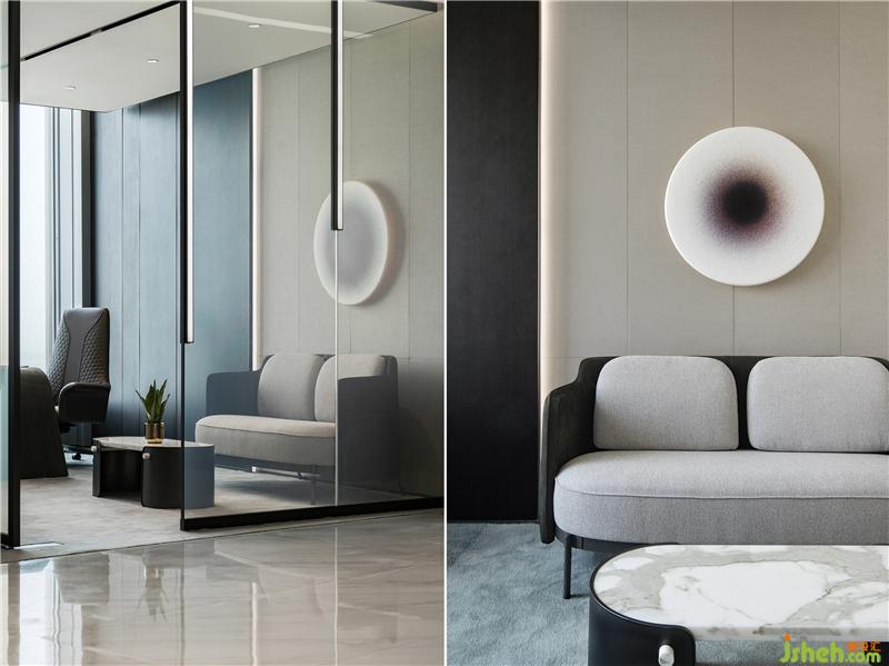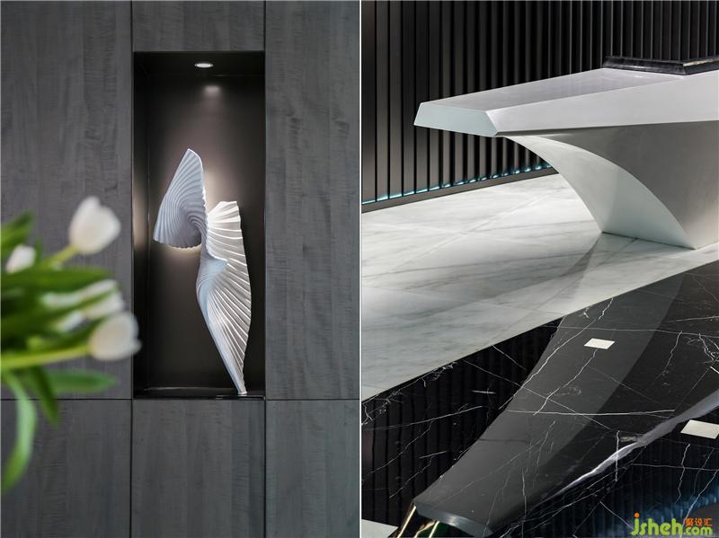 藝術是空間的底色,藝術作品應當具有人文關懷和文化啟蒙。設計師根據(jù)行業(yè)屬性及企業(yè)文化創(chuàng)作的雕塑作品“源”,通過一層層的亞克力、形似煤炭的石子,疊加構成樹的姿態(tài),形成虛實的變化,也成為吸引人駐留的一隅清凈處。