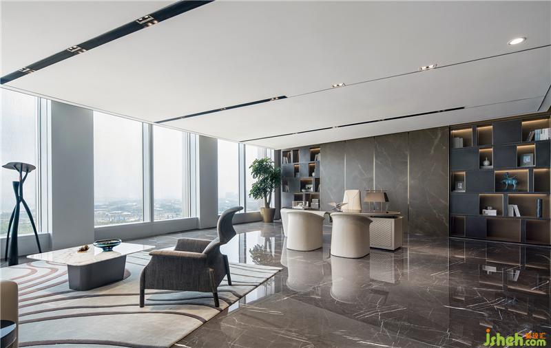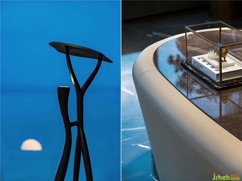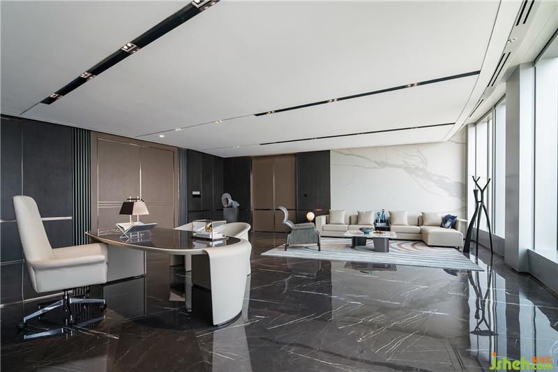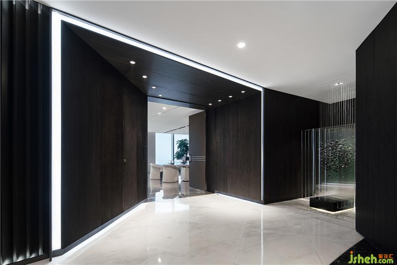 公共區(qū)域由獨立的門廳過渡到vip商務(wù)室。通過面部識別后,兩扇門緩緩開啟--儀式感和科技感正是通過這樣的場景傳達給來訪者。整排的落地窗外,映入眼簾的是一覽無余的絕佳海景,帶來在云之巔的尊貴體驗。