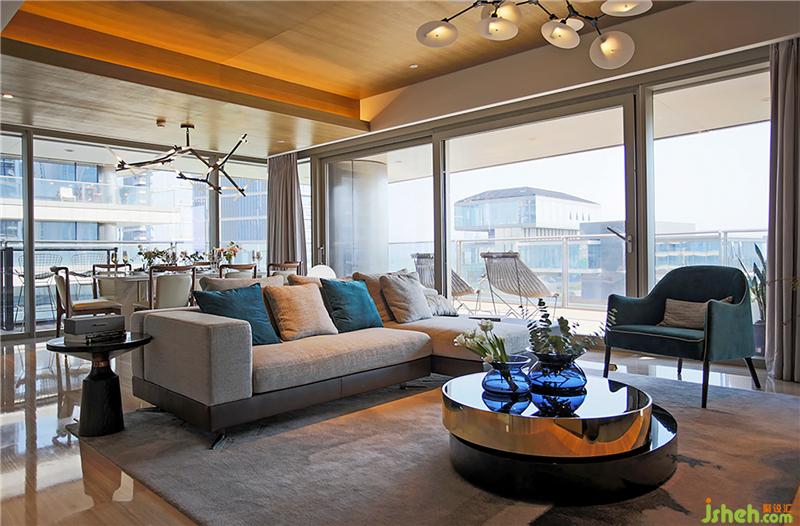 L型沙發(fā)前安置可以通過旋轉控制使用面積的茶幾,