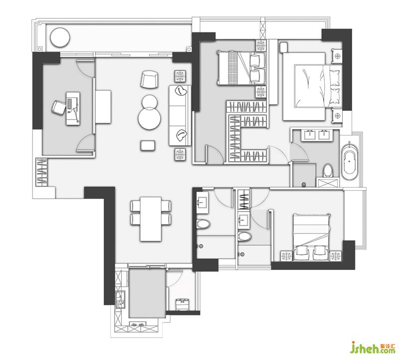 1. 書房、客廳、餐廳形成開放的空間 ,視野更開闊,大大的采光面最大限度的將陽光引進;