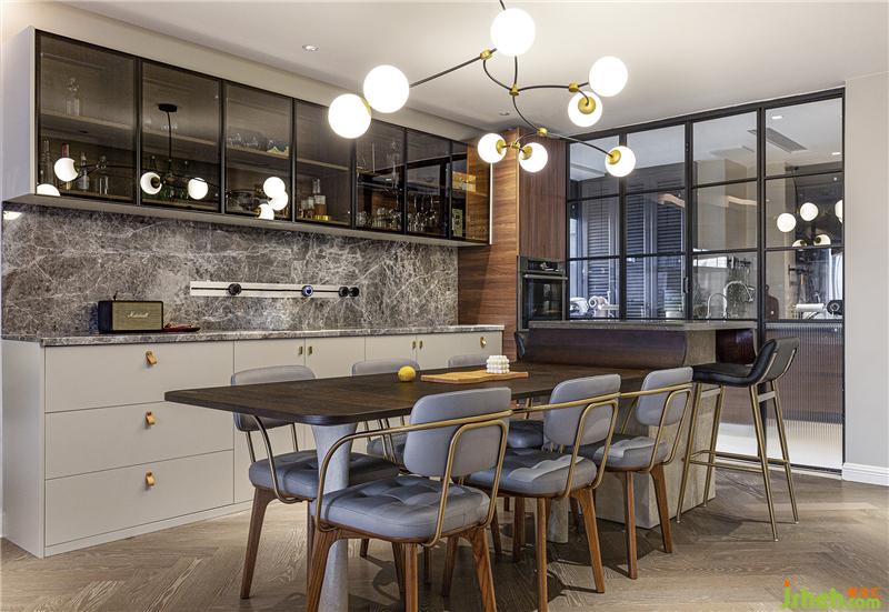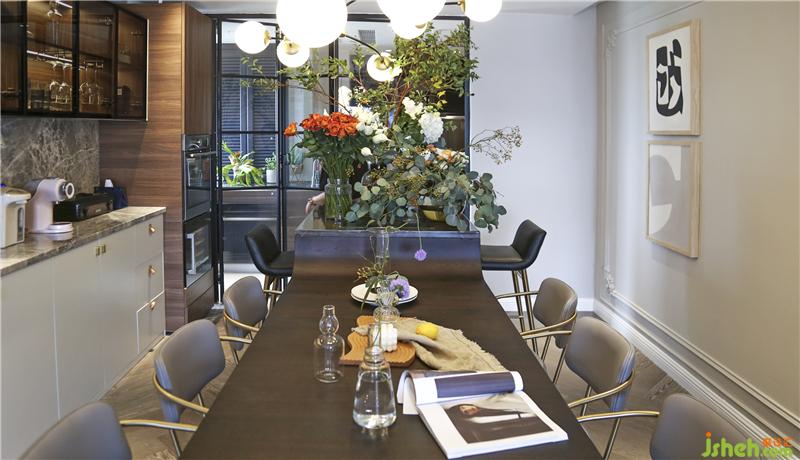 軌道插座可以隨意移動和增加插座的數(shù)量,滿足各類小家電的使用需求。餐桌中島部分也是花藝陳設的最佳位置,花團錦簇隨時準備一場盛大的party。室內(nèi)設計師